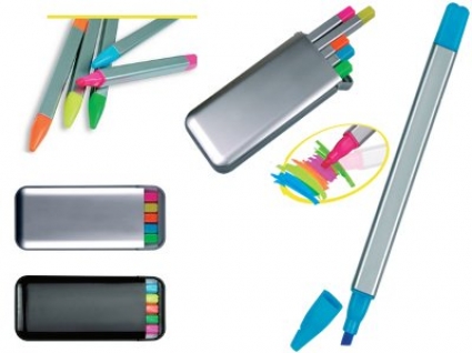 Kit de canetas marca texto com estojo de plástico.