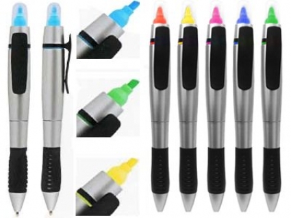 Caneta em plástico 2 em 1, esferográfica com marca texto. Detalhe emborrachado.