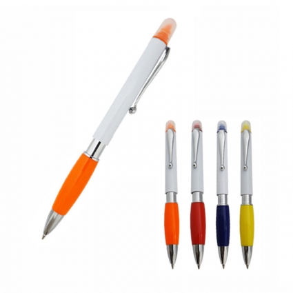 Caneta em plástico esferográfica com marca-texto.